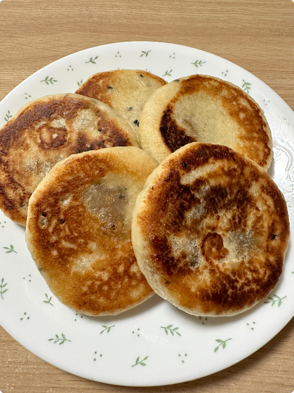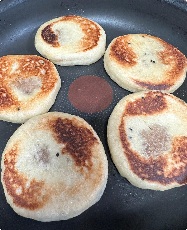 기름을 살짝 두르고 구워 봤는데, 저는 이 방법을 추천드려요. 표면이 노릇노릇하게 구워지면서 바삭한 식감이 살아나고 , 속의 꿀도 잘 녹아서 진짜 길거리 호떡 같은 느낌이었어요. 중불에서 천천히 구워줘야 너무 타지 않고 안의 꿀도 적당히 녹습니다. 살짝 번거롭긴 하지만 맛있는 호떡이라면 역시 팬에 구워 드시는 걸 강추드려요.